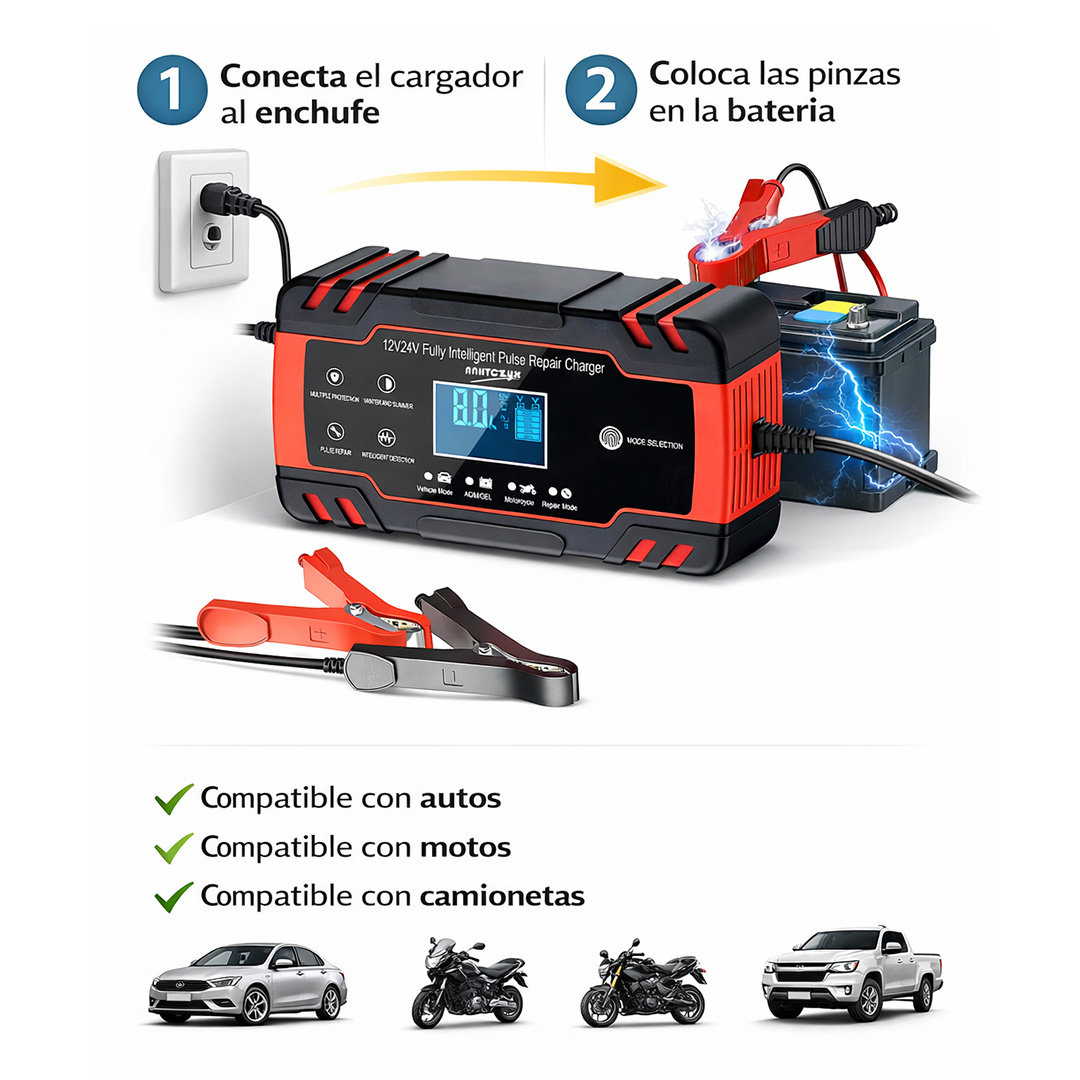 - Cargador de batería 12V y 24V compatible con autos y motos